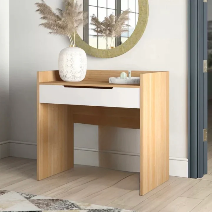 Its sleek and modern design boasts clean lines, minimalist shapes, and a focus on functionality. The dressing table features a spacious top surface, ample storage, and a stylish mirror.